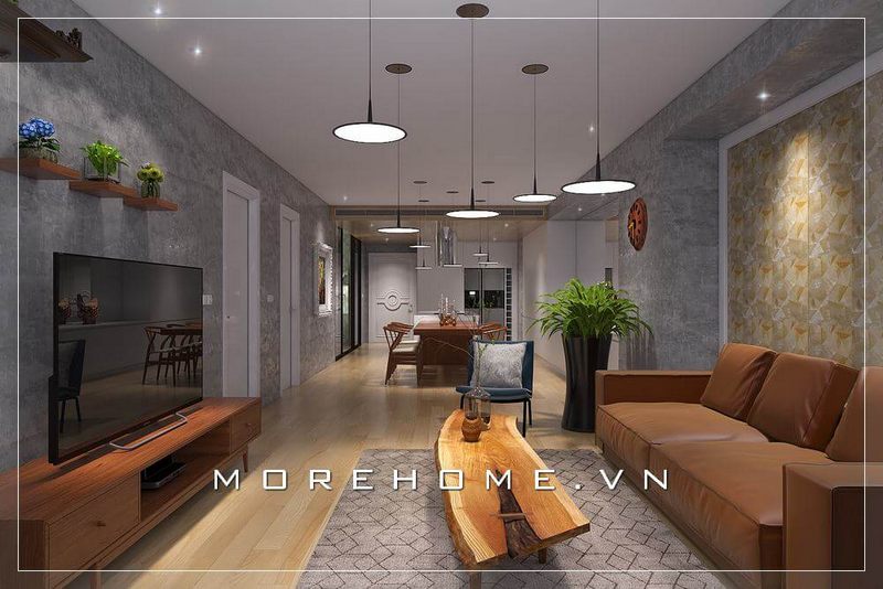 Mẫu thiết kế phòng khách chung cư cao cấp này là sự kết hợp của những bộ sofa da cao cấp, bàn trà gỗ nguyên tấm độc đáo, kệ ti vi gỗ nhỏ gọn kết hợp cách trang trí độc đáo mang đến không gian sống lí tưởng