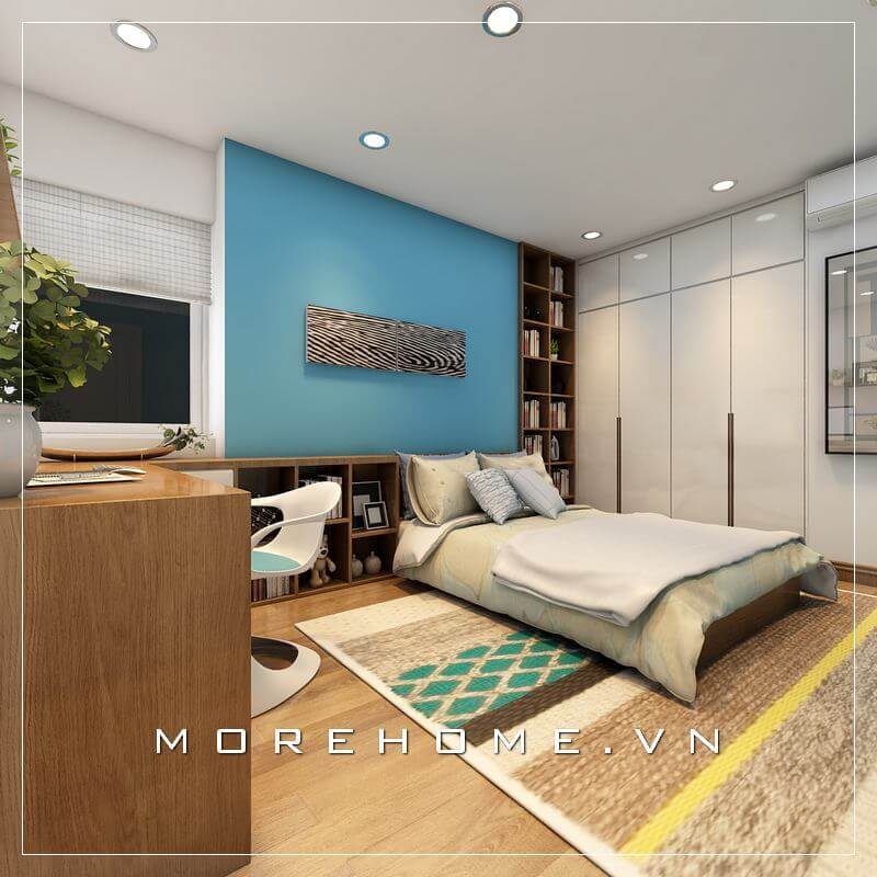 Thiết kế giường ngủ con trai phong cách hiện đại, trẻ trung, ở không gian này, KTS cũng lựa chọn tone màu trắng chủ đạo mang lại cho khu vực phòng ngủ thêm cơi nới, rộng rãi hơn