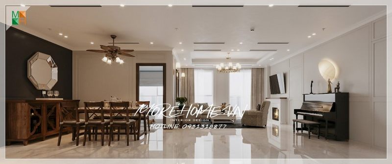 Bộ bàn 6 ghế gỗ phòng ăn và bộ ghế sofa phòng khách như 2 phong cách kết hợp giữa một bên cổ điển và hiện đại tạo nên điểm khác lạ cho mỗi khu vực nhưng nổi bật cho tổng thể chung cư hiện đại