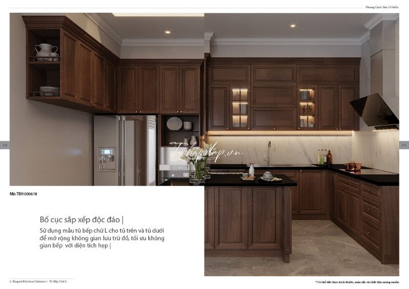 Cả tủ bếp trên và tủ bếp dưới đều được thiết kế theo hình chữ L từ chất liệu gỗ óc chó nâu đẳng cấp phong cách tân cổ điển mang đến cảm giác gần gũi nhưng không kém phần sang trọng.