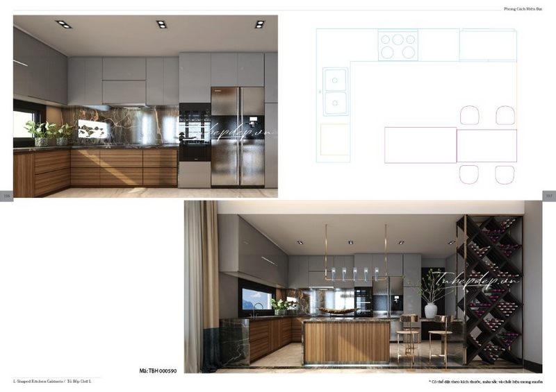 Hệ thống tủ bếp hiện đại chữ L tiện lợi để lưu trữ đồ đạc, thiết kế kệ để rượu hình thoi đan xen độc đáo tạo các hình khối thú vị cho phòng bếp căn hộ