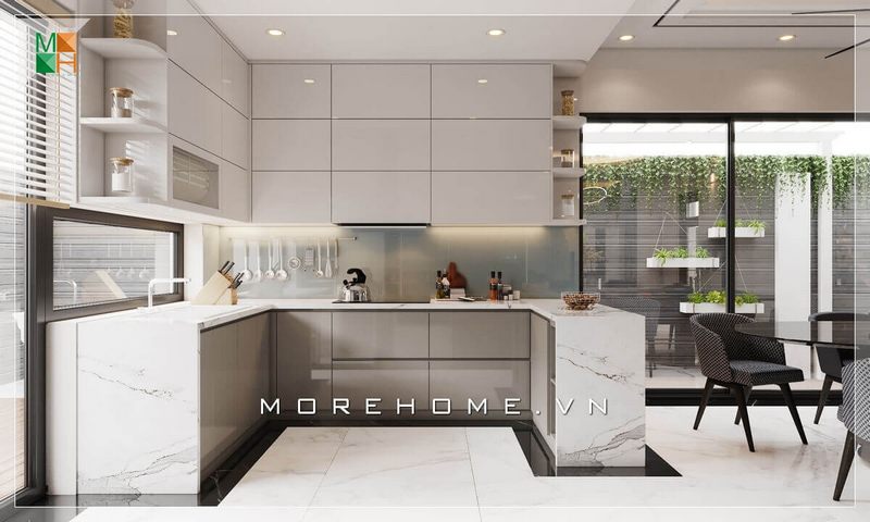 Phòng bếp có đá ốp bếp màu trắng vân mây mang lại ấn tượng tuyệt vời cho gia chủ.