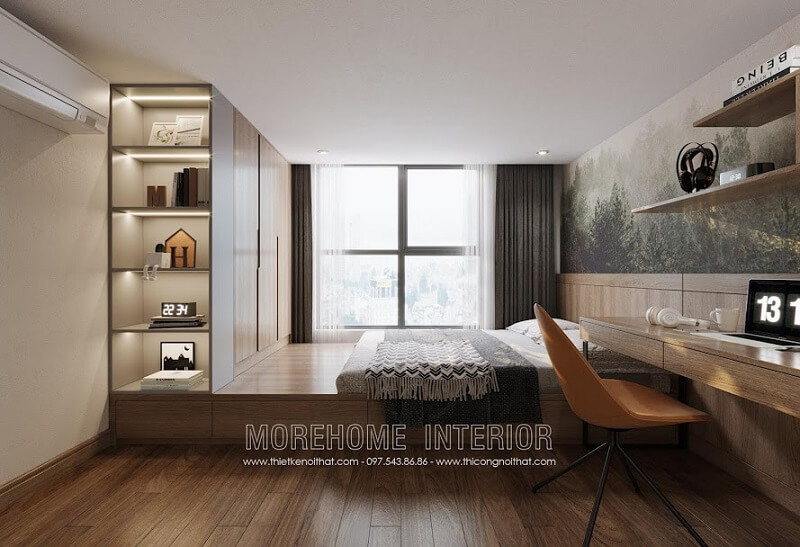 Nội thất phòng ngủ gỗ tự nhiên với thiết kế ấm tường giúp diện tích phòng rộng thoáng hơn