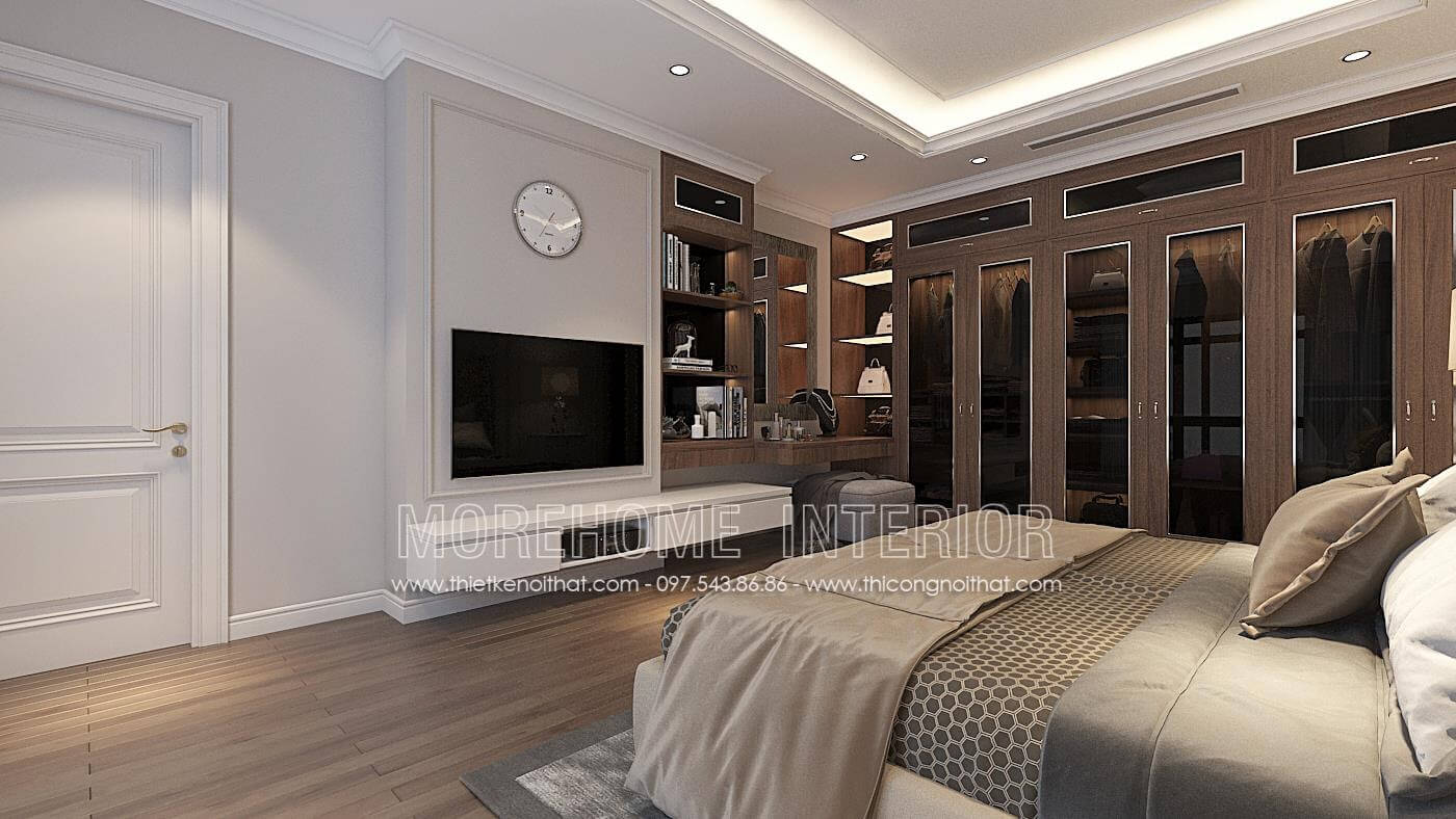 Mẫu thiết kế tủ quần áo phòng ngủ chung cư cao cấp kết hợp kệ trang trí mang lại sự tiên nghi, nhỏ gọn