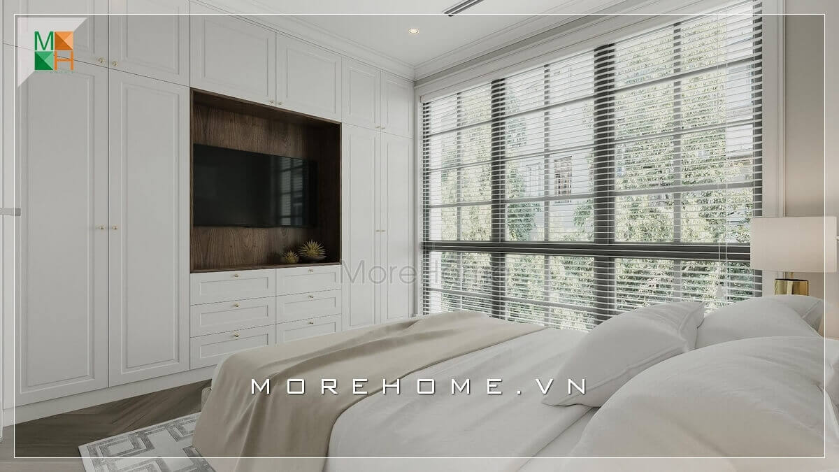 Không gian phòng ngủ trở nên gọn gàng hơn bao giờ hết với hệ thống kệ tủ chạm trần