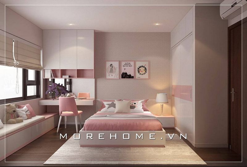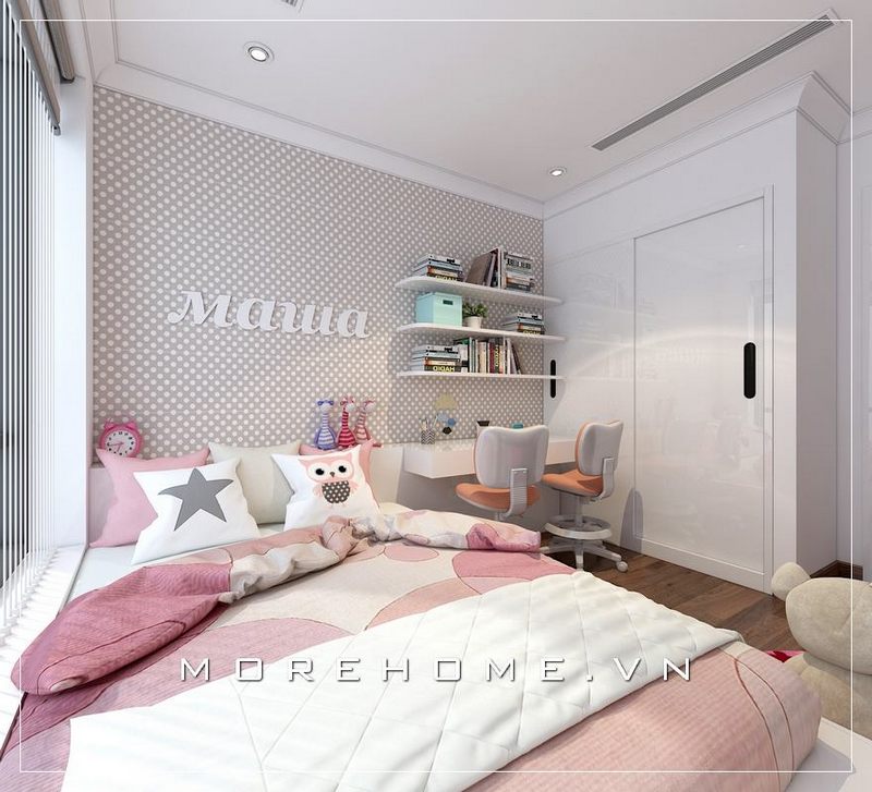 Tủ quần áo gỗ công nghiệp âm tường, tone màu trắng nhã nhặn kết hợp màu hồng nhẹ nhàng mang đến không gian phòng ngủ con thêm đẹp mắt, dễ thương hơn