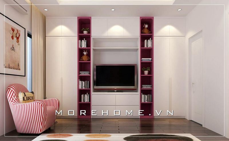 Thiết kế tủ âm tường gỗ công nghiệp khiến không gian căn phòng trở nên rộng rãi hơn rất nhiều. Gam màu trắng phù hợp với mọi độ rộng hẹp của không gian, làm sáng bừng cả một góc phòng