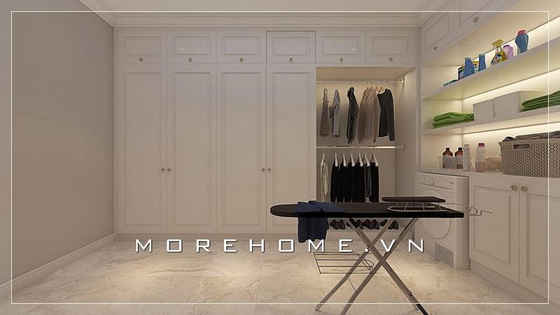 Bố trí tủ quần áo âm tường kích trần mang đến cho khu vực thay đồ thêm rộng thoáng hơn